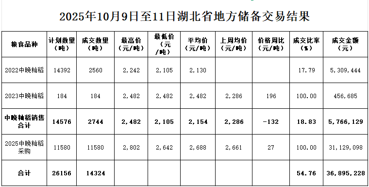 本周(2025年1091011日)湖北无国家政策性粮食投放。